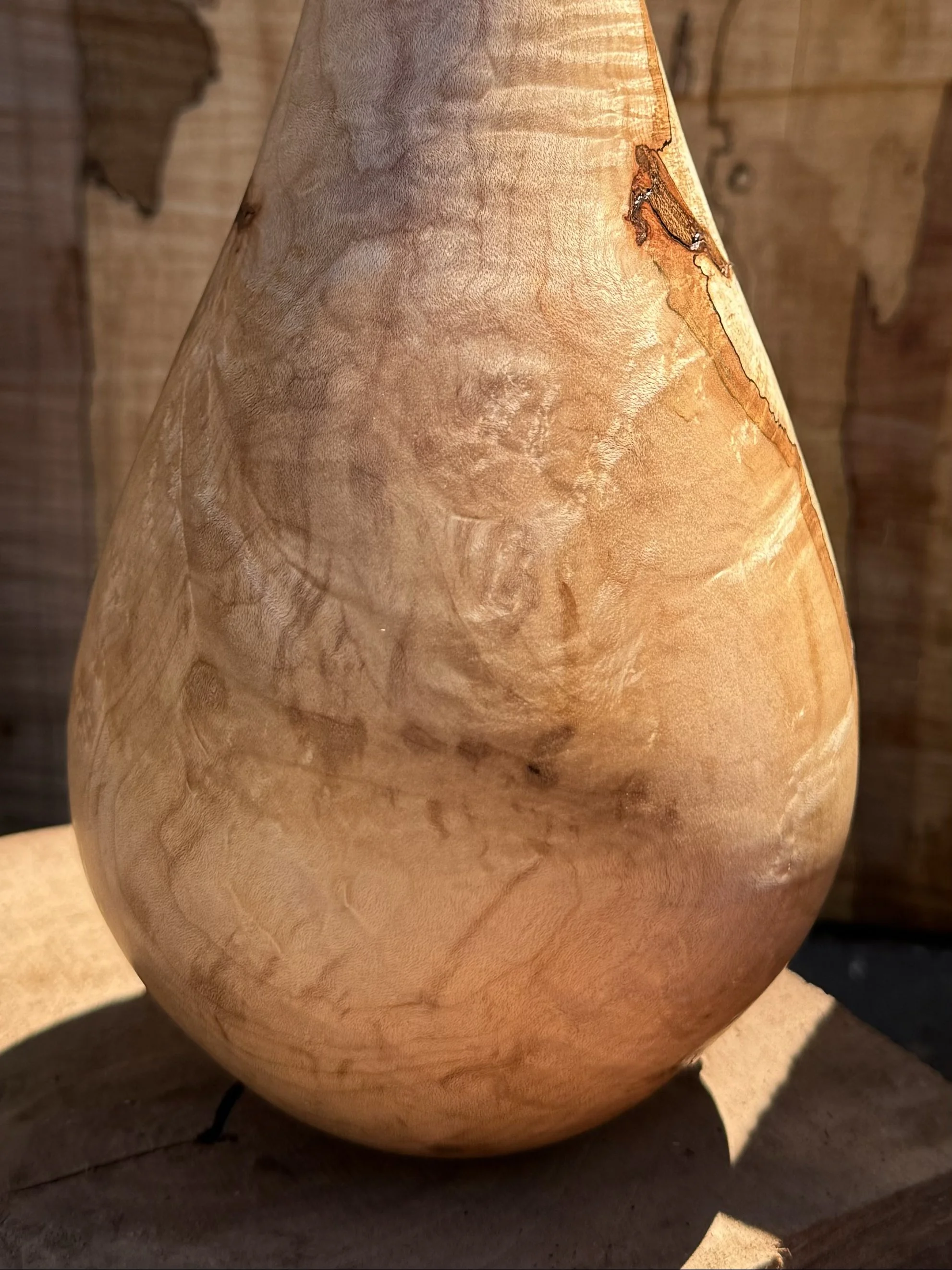 THIS TEAR DROP SHAPED SPALTED MAPLE VASE IS BEST SUITED FOR A VERY SIMPLE ARRANGEMENT OF A SINGLE STEM. AS NO TWO PIECES OF SPALTED WOOD ARE THE SAME . THIS IS A SPECIAL ONE OF A KIND PIECE.